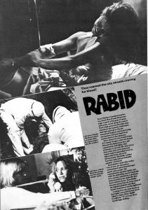 A page article from the January 1978 issue of ABC Film Review: This 1977 Sci-Fi horror receives a 6.3 rating on the IMDb. Directed by the specialist in body horrors David Cronenberg and starred Marilyn Chambers, Frank Moore and Terri Hanauer. Surgery leaves a Montreal motorcyclist with a bloodsucking appendage in her armpit and soon she has an insatiable thirst for human blood. Major 8 Movies (M8M), released several of Cronenberg’s films all as 400′ cutdowns.