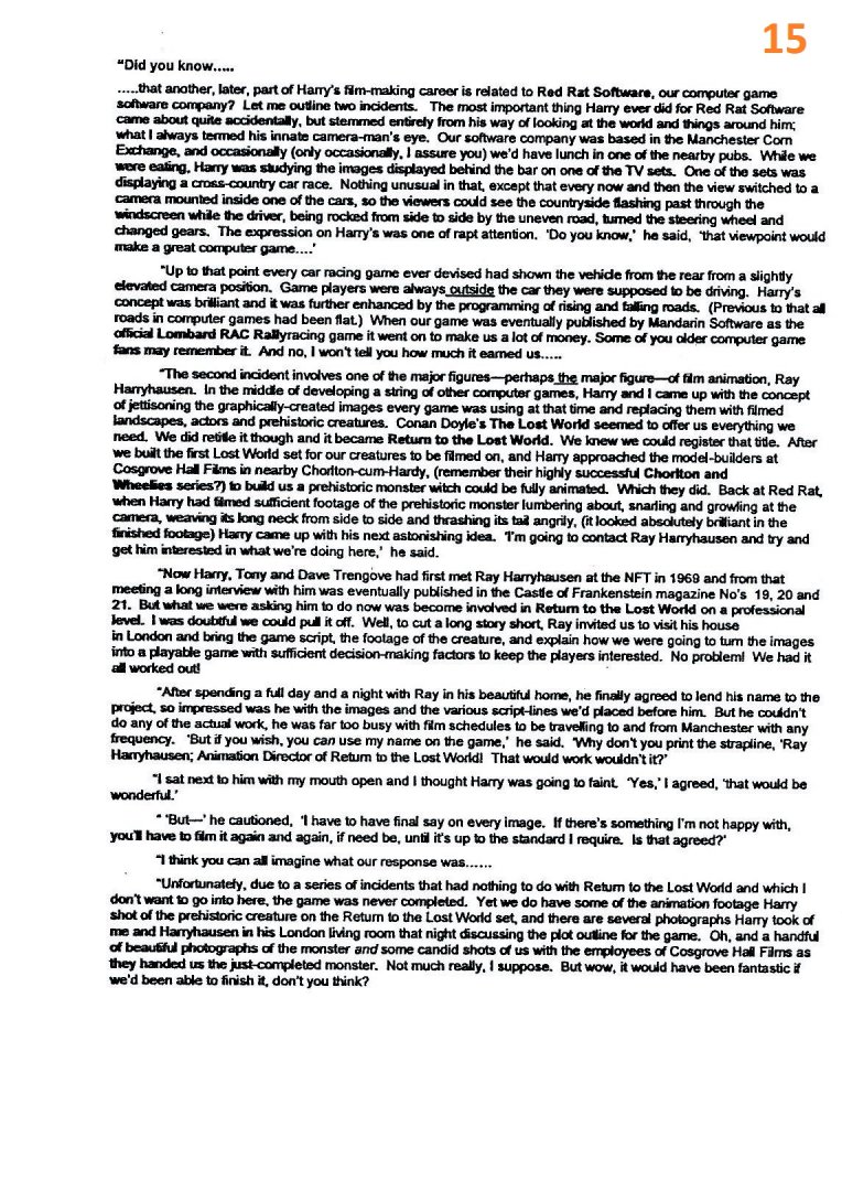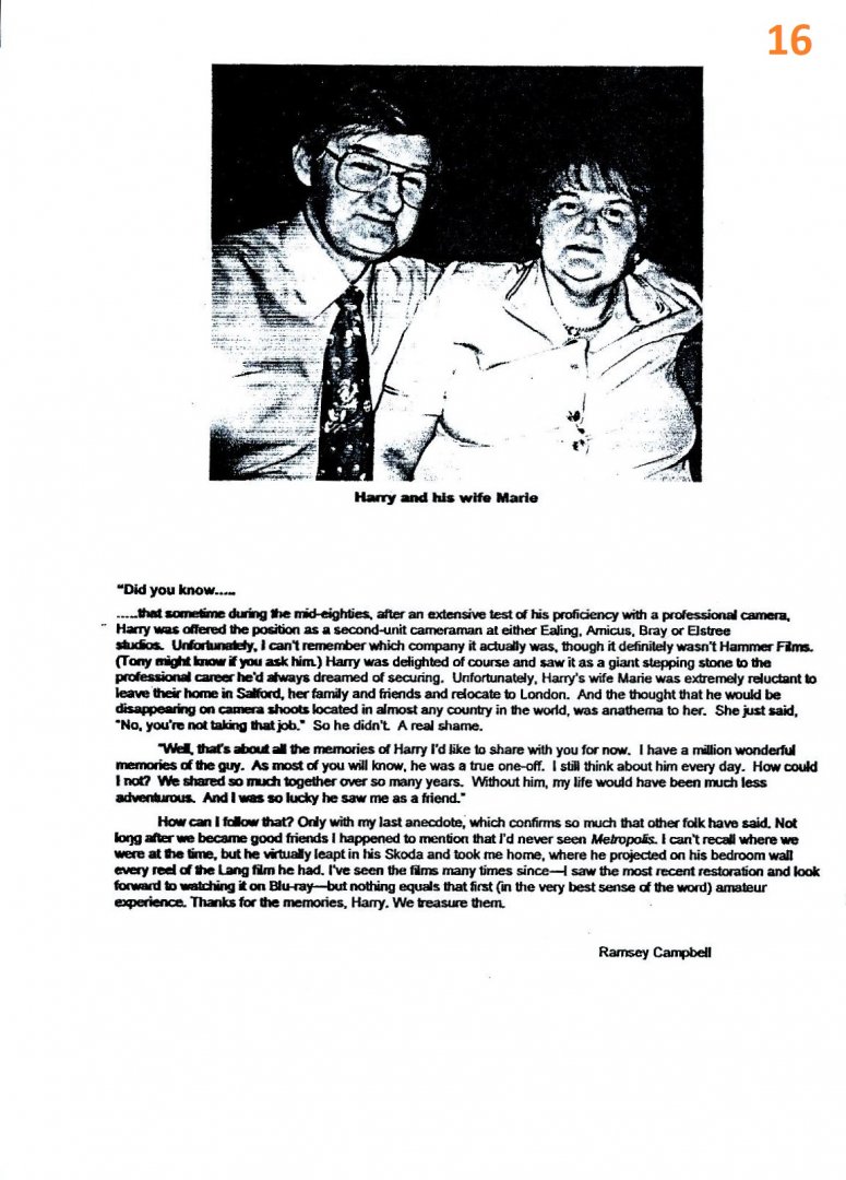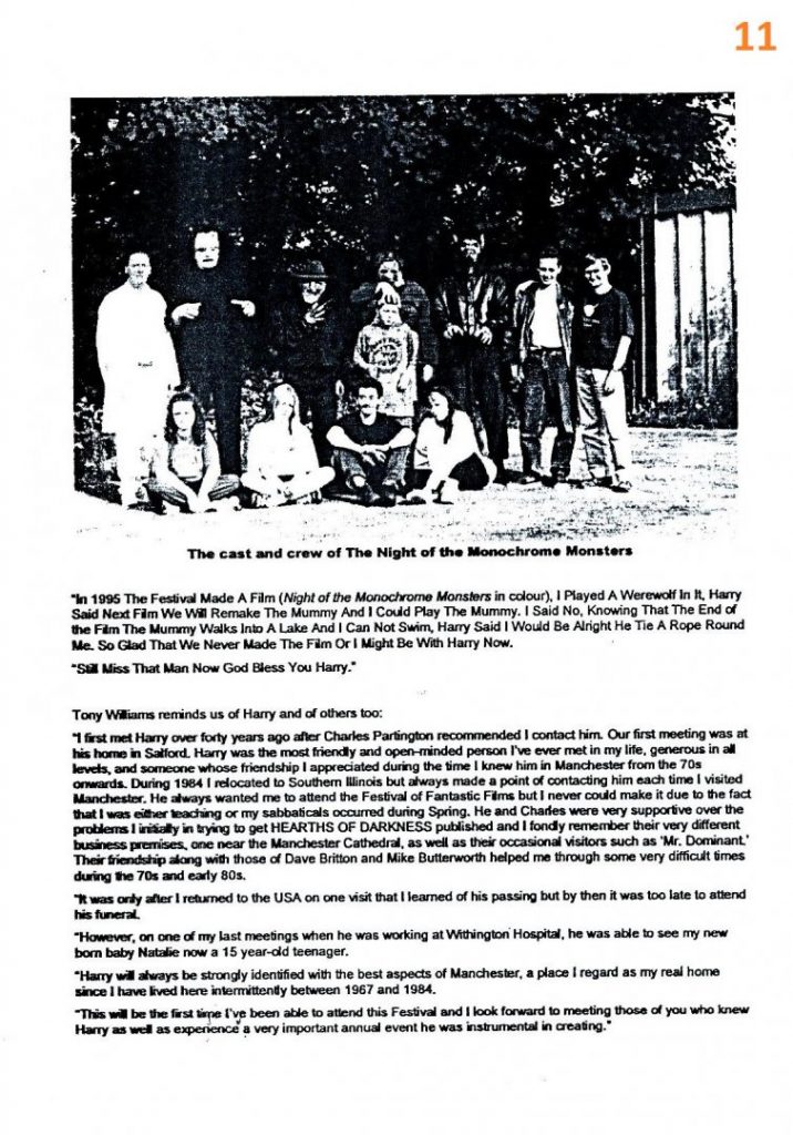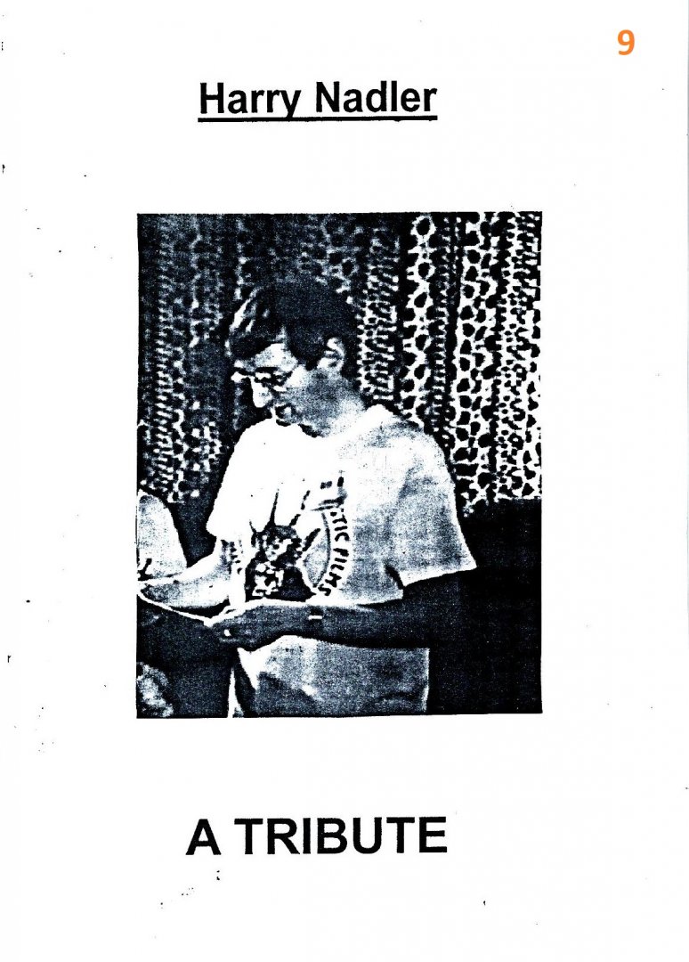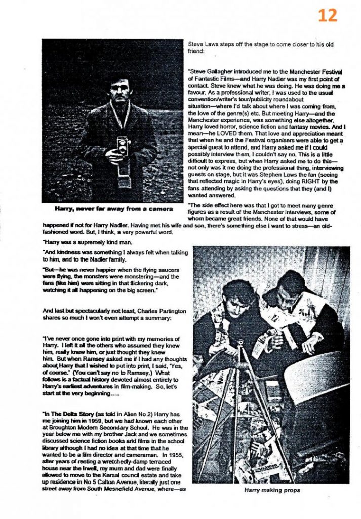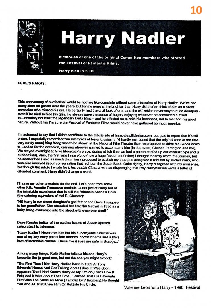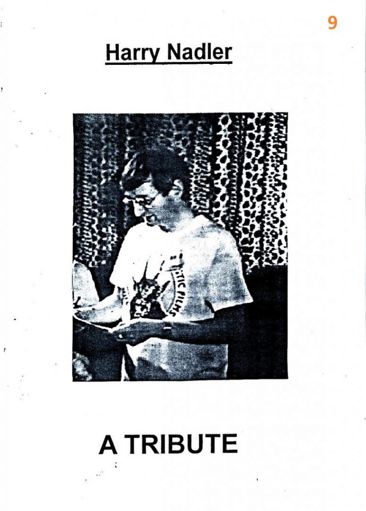 Harry passed away in 2002 and a special eight page commemorative leaflet was written by President Ramsey Campbell, [9 – 16], along with contributions from other commitee members. Author Ramsay Campbell had been a long time friend of Harry’s and in his 1989 novel ‘Ancient Images’ a story concerning Sandy Allen, a film editor trying to uncover the truth about an unfinished Lugosi/Karloff movie, we meet a horror film fan who gives some assistance, with information to Sandy…. and the fans name just happens to be Harry Nadler!