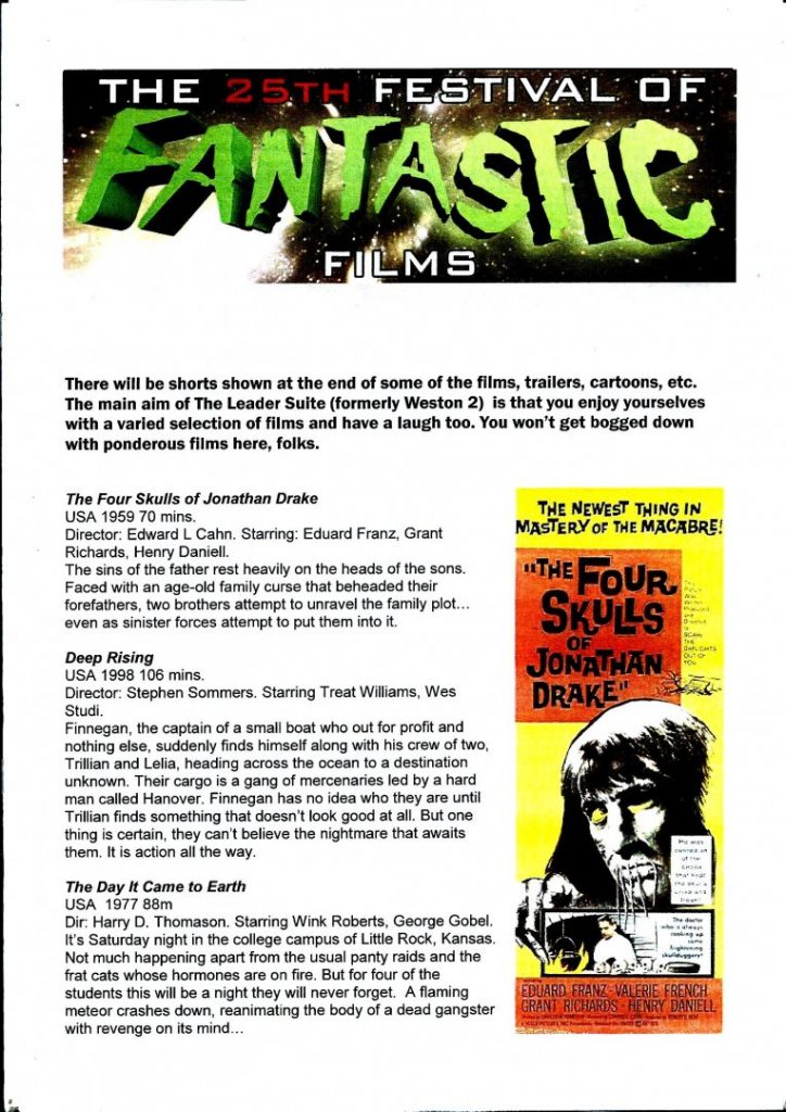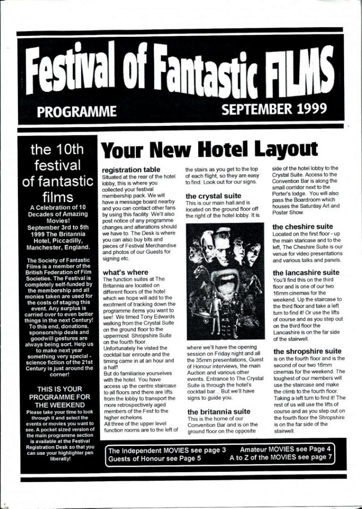 This was such a success that it was decided to organise a 3 day weekend festival in October of that year and so the ‘Festival of Fantastic Films’ was born and has been held every year until the present day. 2020, like so many other annual gatherings was held over due to the Covid pandemic, but will return in 2021. [2 – 8]
