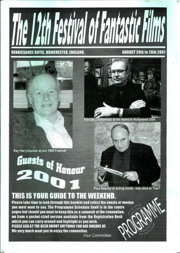 It was Harry who persuaded me to attend one of the Manchester festivals. The year was 1995 and I was silently cursing myself for weeks afterwards for not starting my visits ealier, I’d had such a whale of a time. Sasha’s was the venue for that first visit, and I’ve never forgotten standing along side a dishevelled Janette Scott, at 3am in the rain, outside the hotel due to a falty fire alarm along with all the other hotel guests! Over the years there have been dozens of guests including Forrest J Ackerman, Ray Harryhausen, John Landis, Roger Corman, Barbara Shelley, Andrew Keir, Ingrid Pitt, Hazel Court…..and more, it’s a long list! One year, President, Ramsey Campbell, who hosts the annual festival auction of fantastic movie memorabilia, introduced Ghibli animation to a full house of horror fans when the billed film didn’t turn up…they loved it. It was 2015 when my prolonged stint in hospital brought my annual visits to an end.