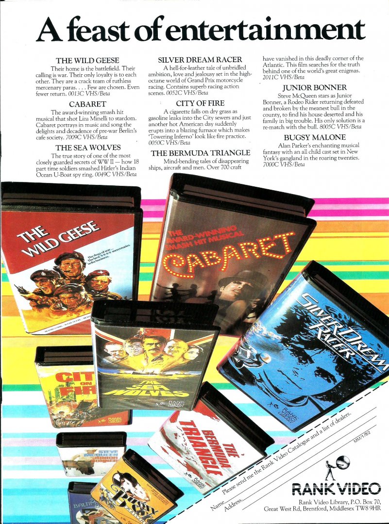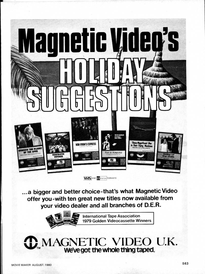 When Movie Maker added the subtitle ‘The Film and Video Monthly’ to its August 1980 cover it signaled what was to come and beckoned the beginning of the end… for a time anyway. Adverts from the video majors would now appear with regularity and even Derann advertised a few of its range in full colour in Movie Maker October 1982. The December issue of 1980s Movie Maker was the first to give an ‘Entertainment Film & Video Guide’, video recorders and cameras were regularly given test reports and by January 1982 Bill Davison was reviewing both 8mm and Video releases. In October 1983 Movie Maker changed its subtitle to ‘The Video and Cine Monthly’, it was also that same year that Walton Films closed down! There seemed to be clearance sales from every 8mm distributor and the amount of space devoted to video was a just a precursor of the things to come. The adverts of Video cassettes almost disappeared, but this was only because there were new magazines like ‘What Video?’, specifically aimed at that market. There was also a new breed of magazine for the ‘professionals’ like “Video Trade Weekly”. I was on the point of handing in my notice more than once, it was a bad time for me. Luckily I never made that decision, just look at what I would have missed out on.