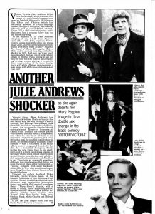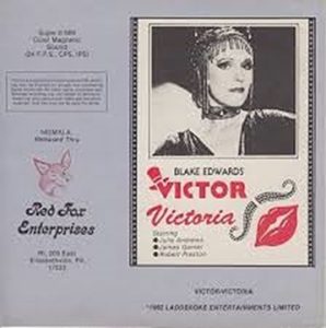 A page article from a film publication dated April: This 1982 musical farce receives a 7.6 rating on the IMDb. Directed by Blake Edwards and starring Julie Andrews, James Garner and Robert Preston. A singer in 1934 Paris finally finds work after posing as a female impersonator, but it gets complicated. This was released as a 8 x 400′ feature by Red Fox in the USA. When Derann took over the negs and sound-masters it was re-cut to fit 4 x 600′ spools. Box art found on the internet.